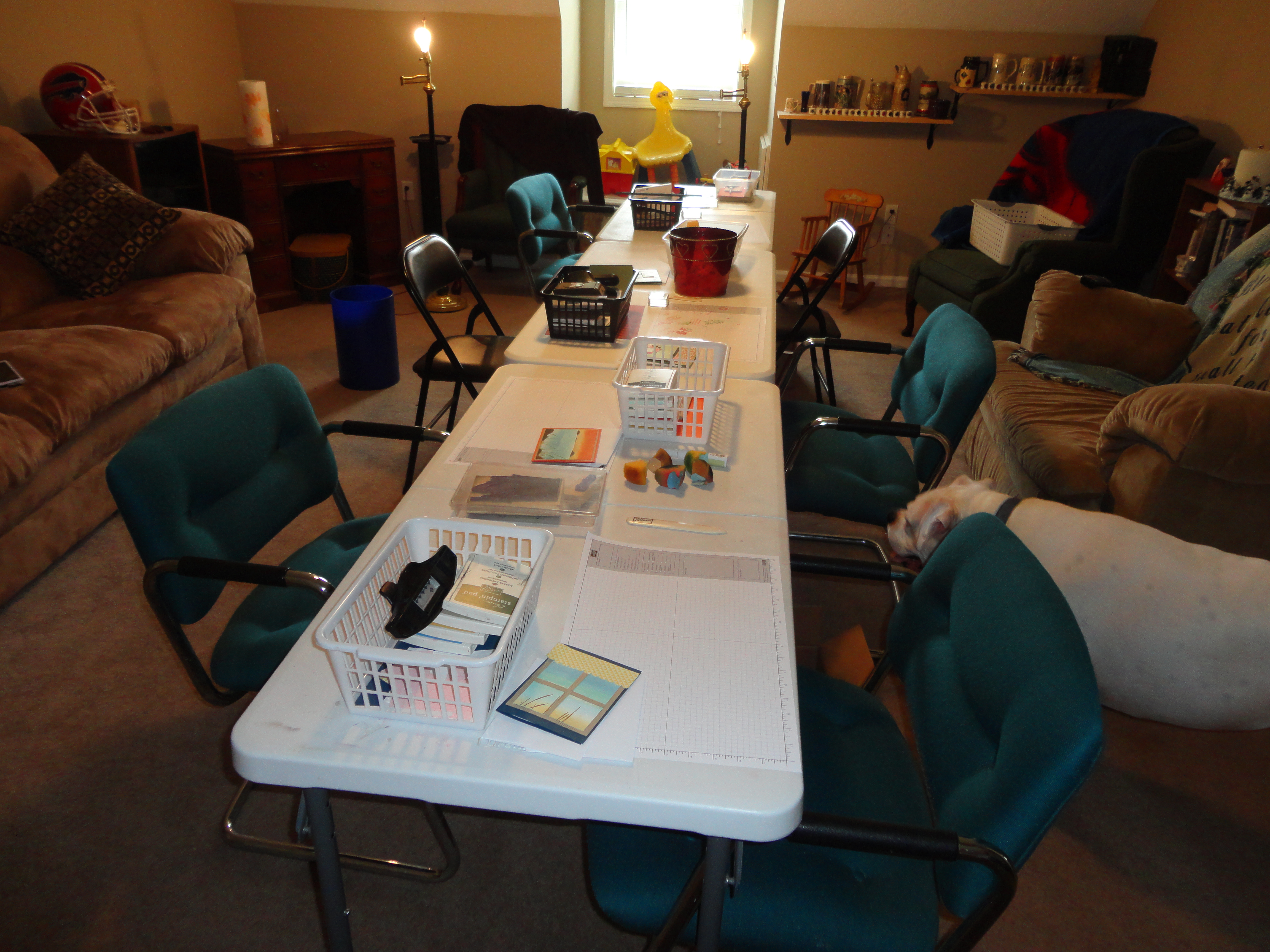 Here are my tables all set up in the family room ready for a class. Notice Dudley our white boxer who is inspecting the room to be sure I have everything in place.